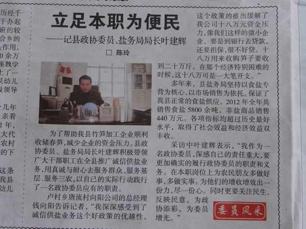 為了幫助我縣竹筍加工企業順利收儲春筍,減少企業的資金壓力。縣政協委員、鹽務局局長葉建輝積極帶領廣大干部職工在全縣推廣誠信供鹽業務,用真誠與耐心去服務群眾、服務基層、服務三農,以自己的實際行動踐行了一名政協委員應有的職責。