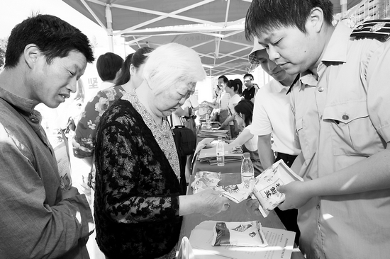 鹽政執(zhí)法人員向消費(fèi)者講解怎樣辨別真假食用碘鹽。5月15日是我國第18個(gè)“防治碘缺乏病日”,省有關(guān)部門在合肥舉行了宣傳活動。(記者許昊攝)