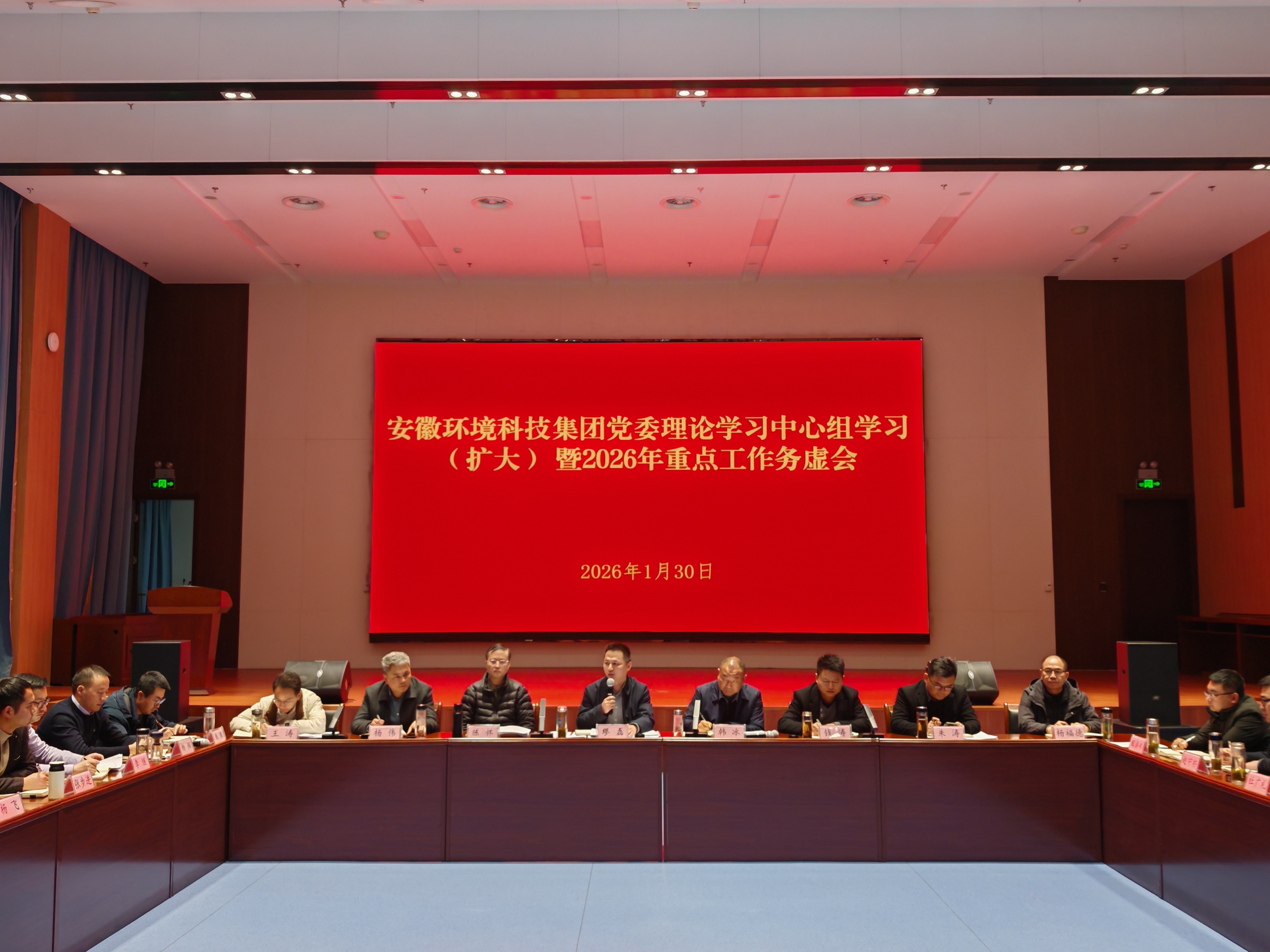 2026年1月30日,安徽環(huán)境科技集團黨委理論學習中心組學習(擴大)暨2026年度務虛會在合肥召開。會議深入學習領(lǐng)會黨中央及省委、省政府近期系列重要會議精神,全面分析內(nèi)外部形勢,系統(tǒng)謀劃2026年發(fā)展藍圖,統(tǒng)一思想、凝聚共識,為在新起點上推動公司轉(zhuǎn)型發(fā)展、實現(xiàn)華麗轉(zhuǎn)身擘畫了清晰路徑。集團黨委書記、董事長繆磊出席會議并講話,黨委副書記、總經(jīng)理韓冰作年度形勢任務分析報告。集團領(lǐng)導班子成員、總經(jīng)理助理、首席研究員、各部門負責人、各子(項目)公司負責人參加會議。